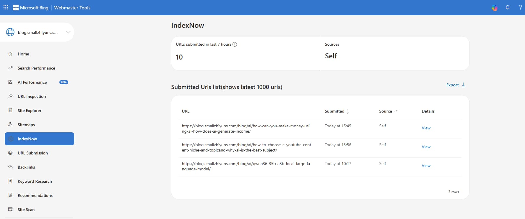 For a new blog site, remember to submit an IndexNow request promptly. However, do not rush to check your analytics dashboard; wait at least a full day before reviewing the data—there is no need to feel anxious.
