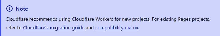 The documentation recommends using Cloudflare Workers for new Astro projects and provides a migration path for Pages.